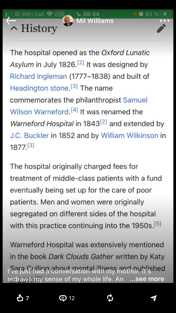 My mum was suffering at the time from acute post-natal depression. I knew already that in 1968 she had received electro-shock treatment. What I didn’t know till today — because I had never been told — was that at the age of nine months I stayed with her in the aforementioned hospital, whilst she underwent a course of eight separate electro-shock events.