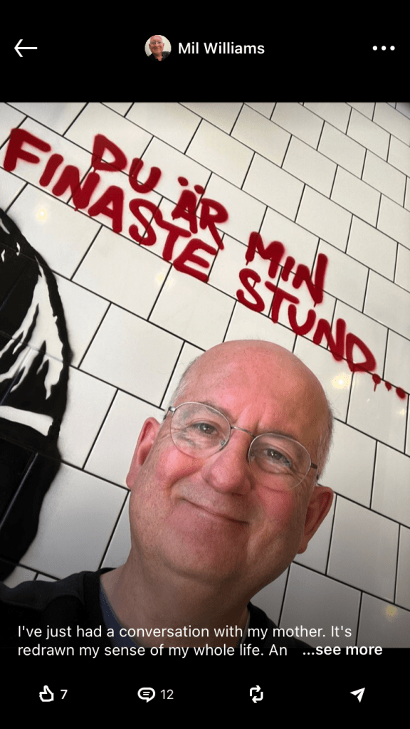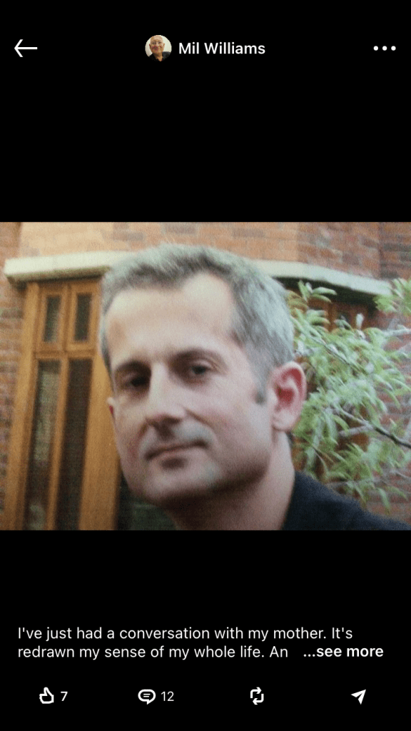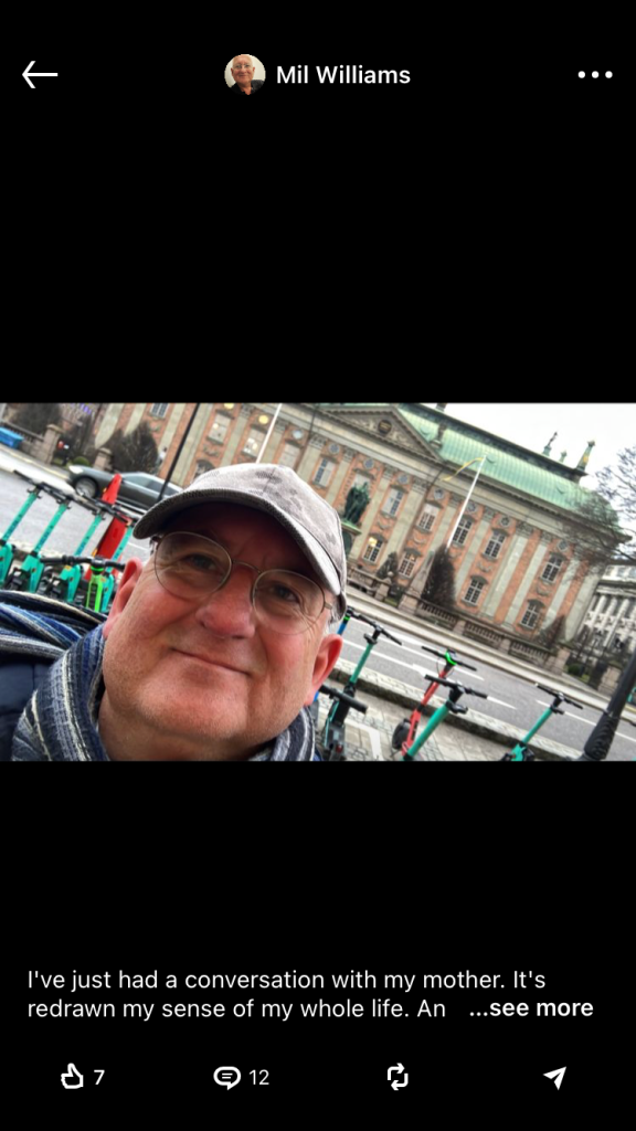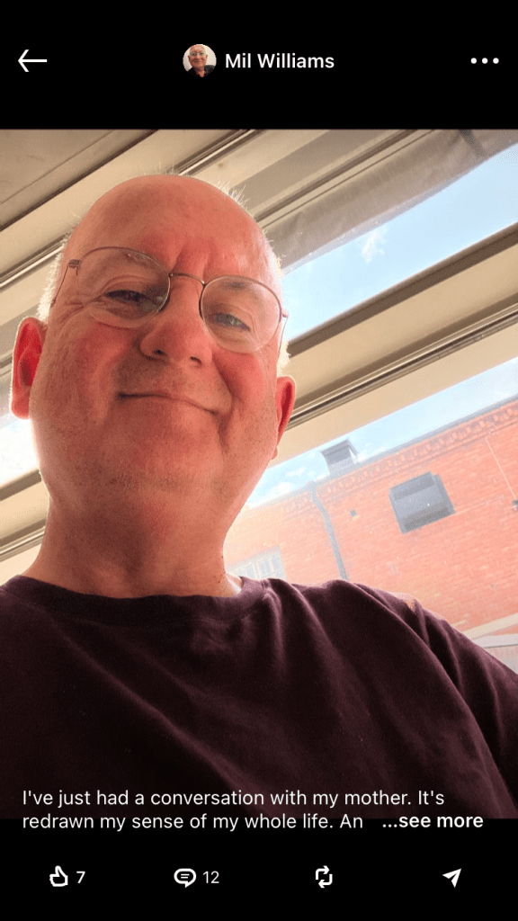 I’ve just had a conversation with my mother. It’s redrawn my sense of my whole life. And therefore of myself.