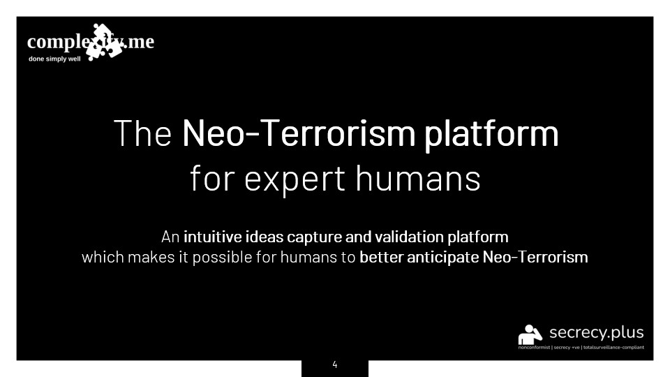 The three product ideas I have chosen for initial consideration by investors all relate to the cause of citizen safety & security. There is one product not included for the moment, in the line of The Neo-Terrorism platform for expert humans and which follows similar principles but is a novel mental-wellbeing platform for households who self-define as dysfunctional and in need of support in repairing their interactions (some preferred the term “healing” when I first proposed it, but today, some years later, I insist on reverting to “repairing”). If anyone is interested in this proposal — there is a full slide-deck available — do contact me on this email address: