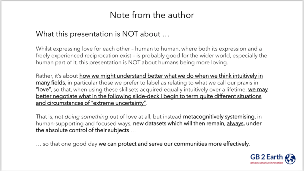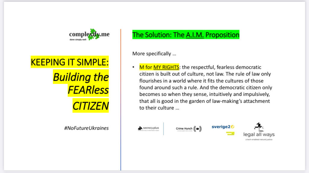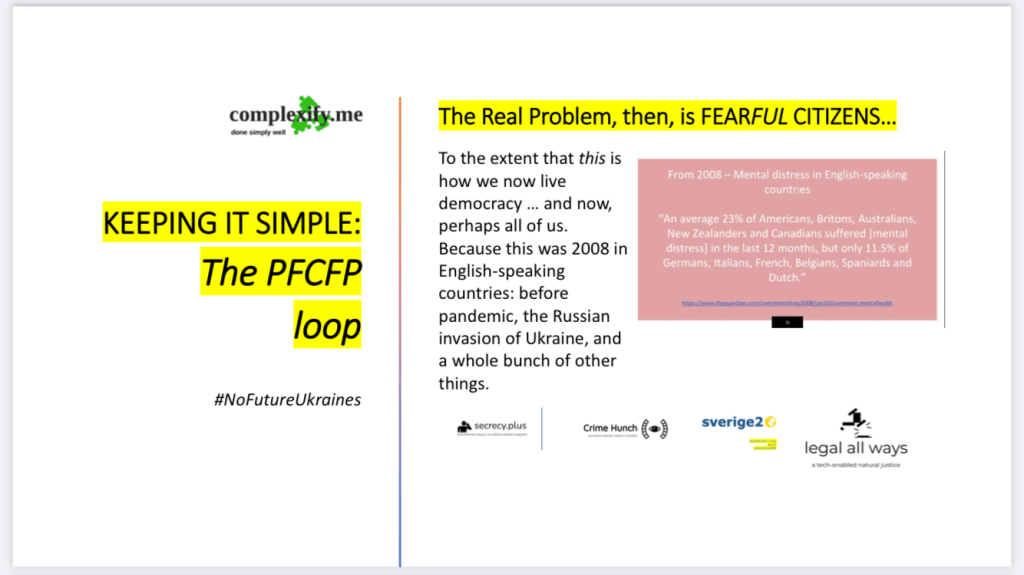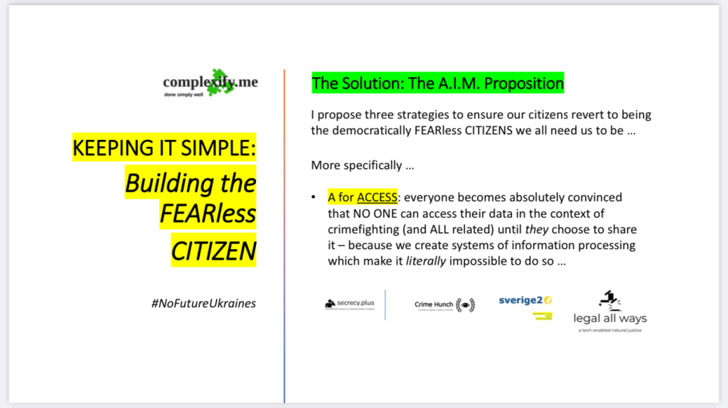 Until countries like the UK accept that our total surveillance-friendly software architectures (admins who see all; users who see nothing but even so are aware, all too aware, how they are being permanently surveilled) have fatally inhibited — impaled, even — our own capacity to think creatively in security, crimefighting and law-enforcement contexts, we cannot develop my ideas in respect of security where such acceptance is not forthcoming.